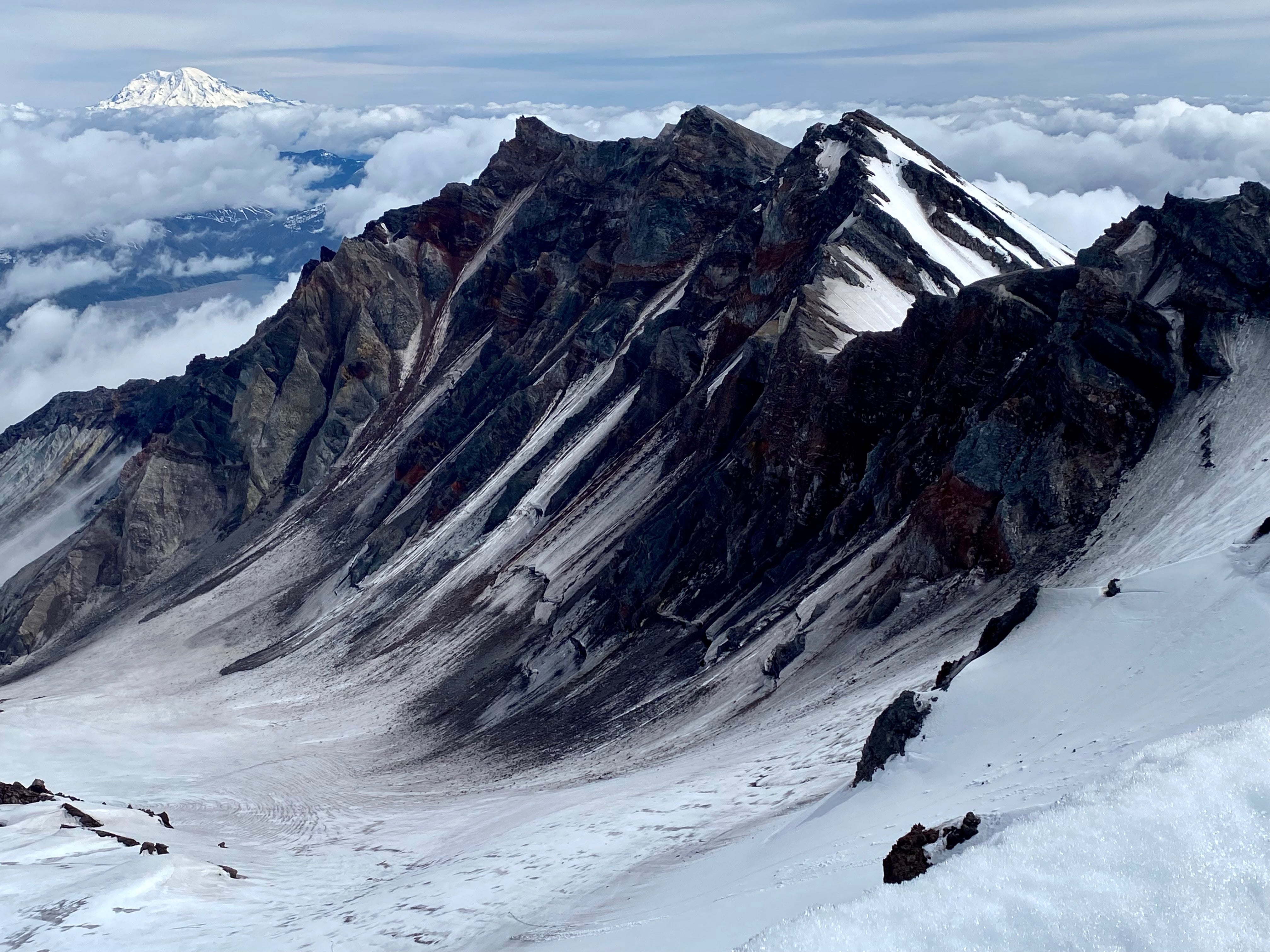 A large cornice guards the crater rim and we were forced to stay many feet back for fear of it collapsing. At this point, the snow had hardened to sheer ice, and we saw many skiers that had arrived before us booting back down their uptrack to below the last steep pitch. Circling the crater towards the west takes you to a small notch in the cornice where it is possible to peer right over the edge into the maw of destruction that was the 1980 eruption. Covered by recent snowfall, we could just make out the hibernating dragon of the Crater Glacier snaking around the lava dome far below, while Mount Rainier poked through the clouds in the distance.