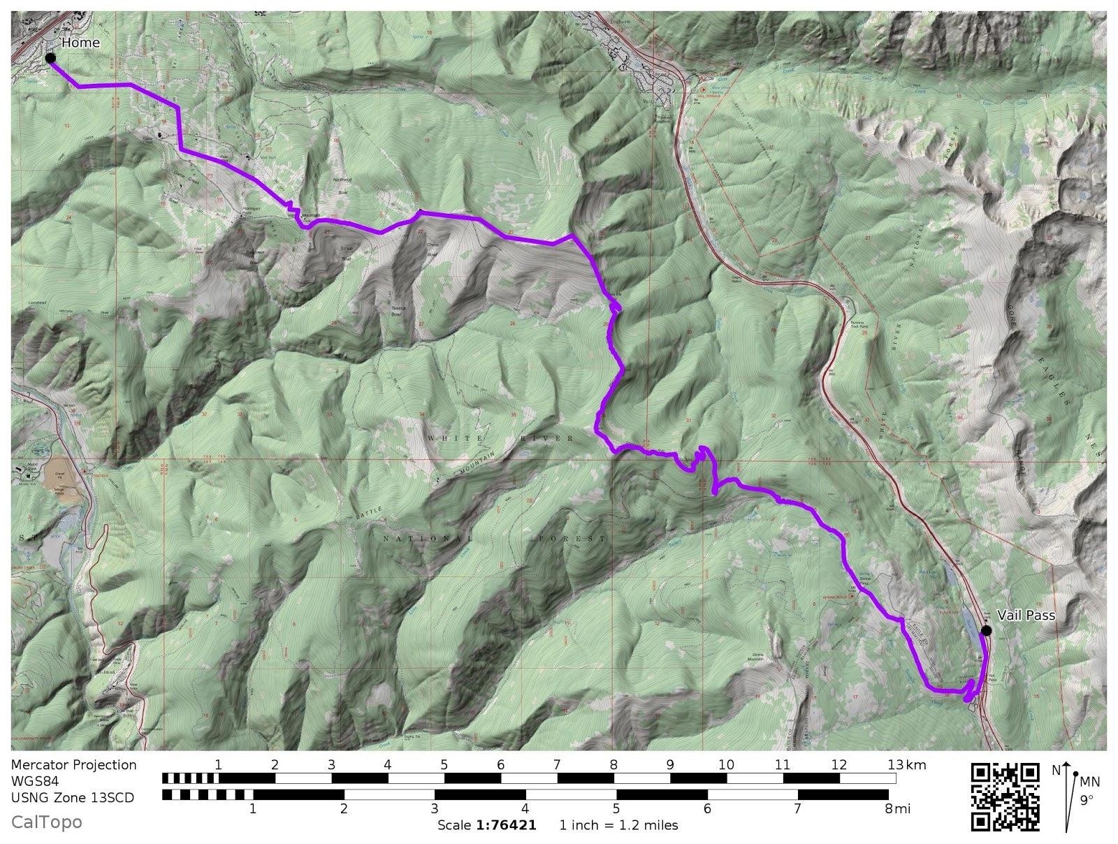 The route comes in three parts. Beginning at the summit of Vail pass, you first climb up the mellow Shrine Pass Road. Next, you deviate from the road, begin to climb to the top of an unnamed 11,710 ft peak and traverse along a ridgeline to the 11,800 ft Red Benchmark peak. The Commando Runs ends with a long downhill upon entering the boundary of Vail ski resort.