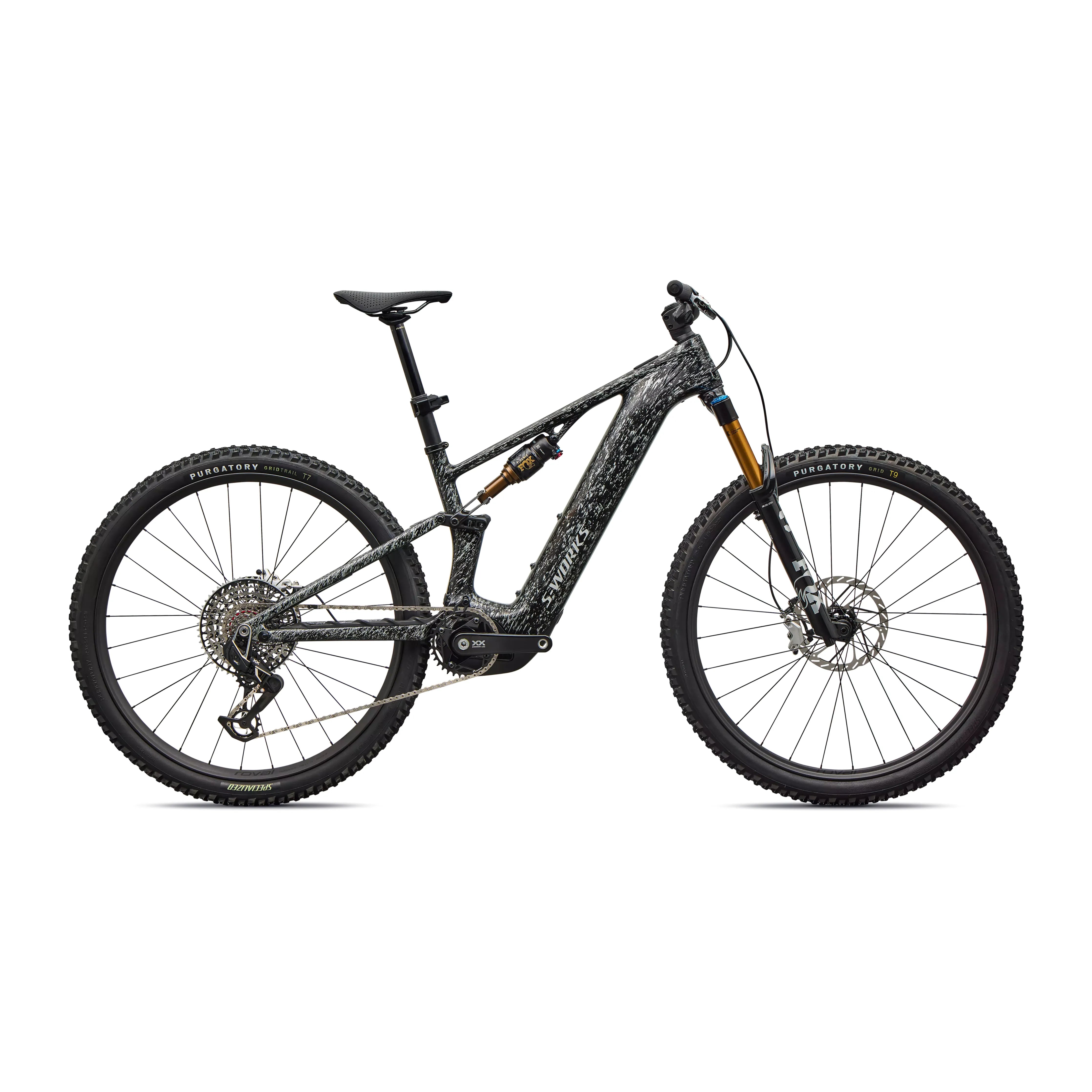 To handle the significant speed this bike generates, Specialized opted for a suspension package featuring a FOX 36 SL Factory fork and the innovative FOX FLOAT Factory GENIE rear shock. This setup provides 140mm of front travel and 130mm in the rear, offering a refined platform that tracks confidently through rough sections without losing its playful character. The build is rounded out with top-tier components, including a SRAM XX Eagle AXS wireless drivetrain, SRAM Motive Ultimate 4-piston brakes, and Roval Traverse SL II carbon wheels spinning on Industry 9 Hydra 2 hubs. Every detail, from the titanium hardware to the S-Works Power Mirror saddle, is chosen to minimize weight and maximize the connection to the trail.